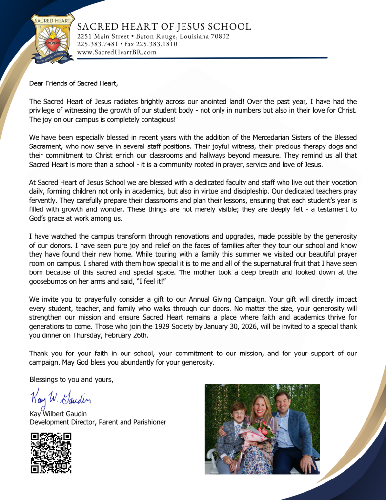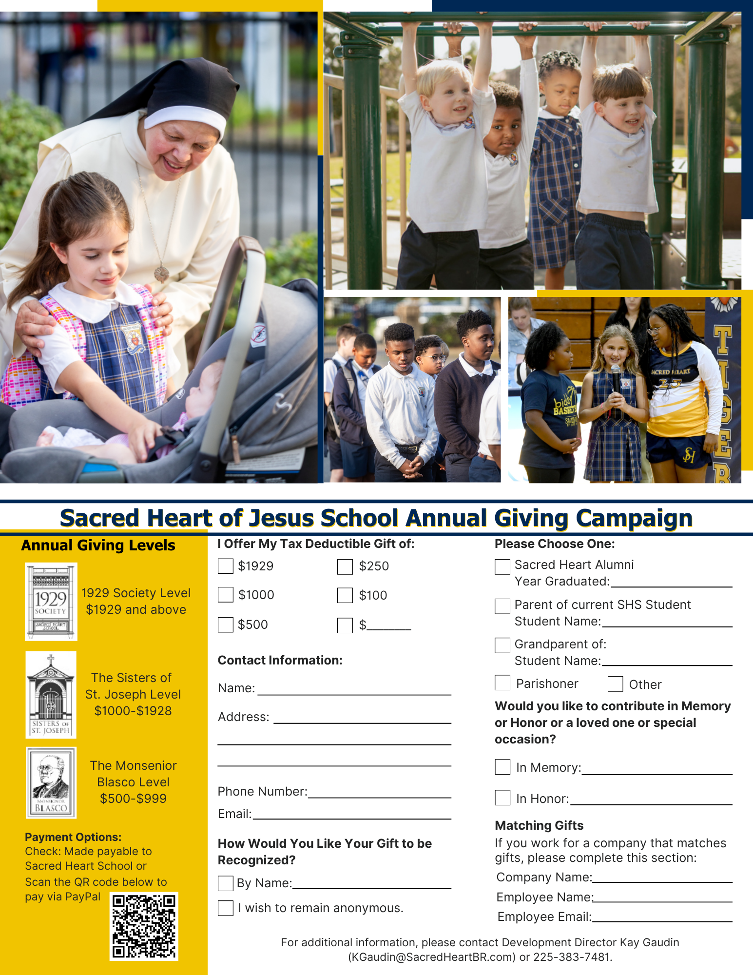 Our Annual Giving Campaign is underway. If you wish to donate to our school, please fill out this form and return it to Kay Gaudin (KGaudin@SacredHeartBR.com) or click here to donate via PayPal.